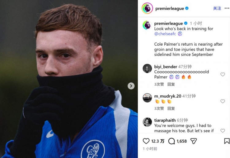 11月25日讯 英超官方社媒在本日晒出切尔西的执行照,此前受伤的帕尔默照旧在投入执行。