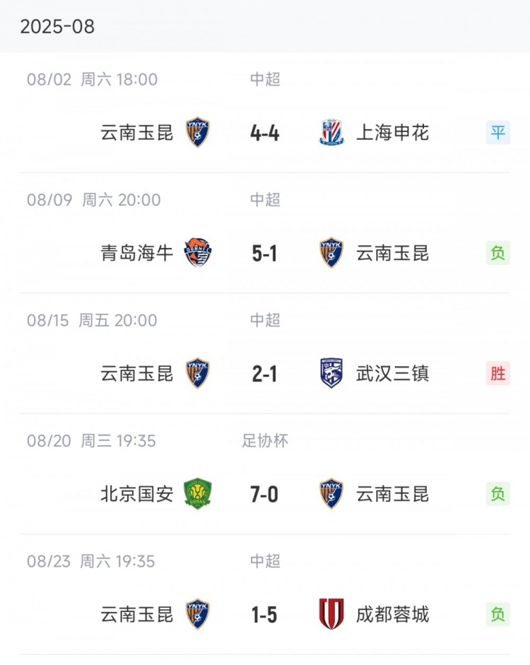 8月份的比赛,云南玉昆相接大比分丢球。此前在足协杯半决赛,十东谈主云南玉昆0-7惨溃逃京国安;中超第20轮,云南玉昆客场1-5惨败青岛海牛。