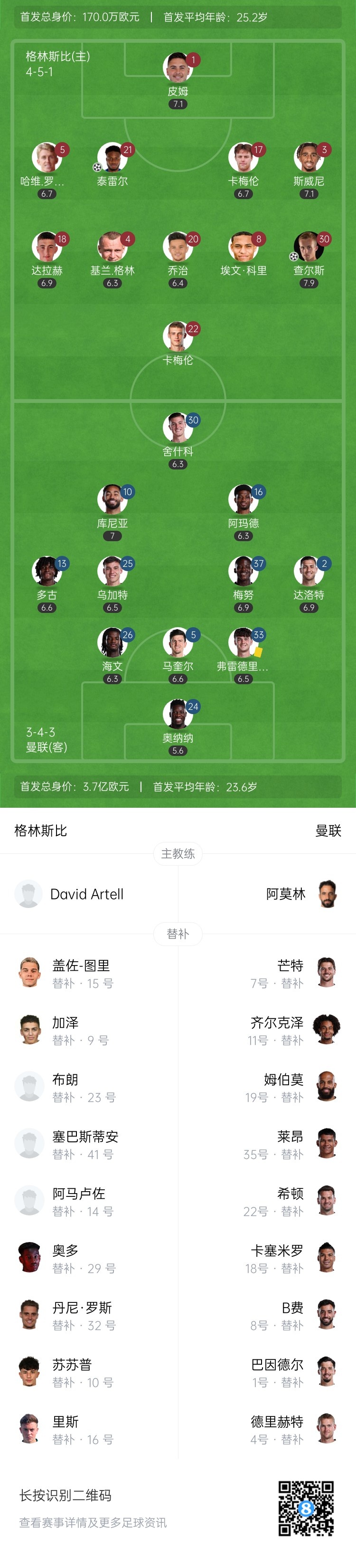 第30分钟,格林斯比左侧角球契机,传中到禁区中,奥纳纳出击空幻,沃伦将球打进佛门!曼联0-2过时格林斯比↓