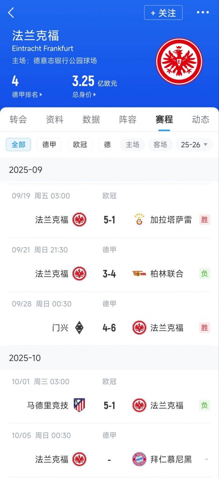 近4场比赛,法兰克福的战绩:5-1加拉塔萨雷,3-4柏林聚会,6-4门兴,1-5马竞,每场比赛至少6球,不是你死便是我一火。下一场比赛,法兰克福主场迎战拜仁。