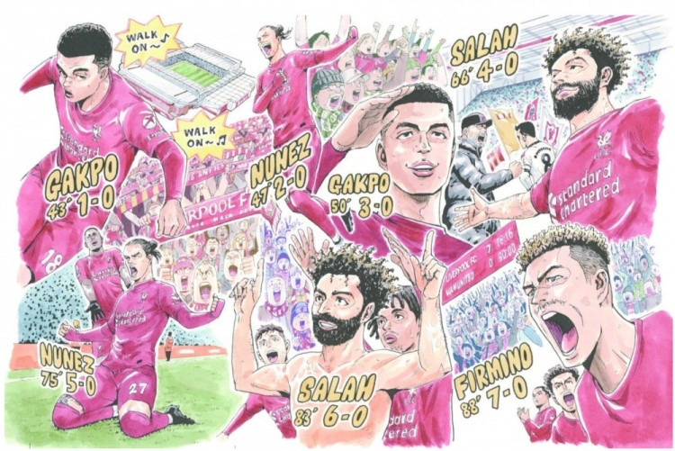 为了缅念念这一历史性时分,日本漫画家辻智(Tsujitomo)创作了一幅极度的漫画作品。辻智以其在《GIANT KILLING》系列中的职责而着名,他躬行走访了默西塞德郡和安菲尔德球场,为这幅作品进行扣问和准备。