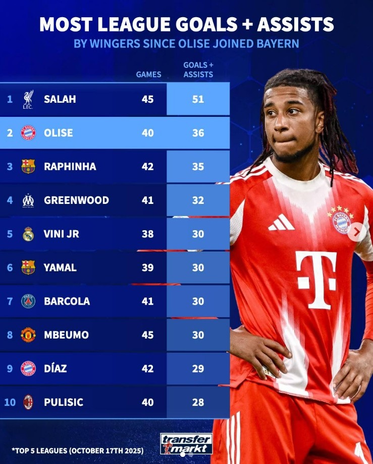 10月18日讯 在德转最新一期球员身价更新中,奥利塞身价高涨3000万欧,达到1.3亿欧。德转也盘货了自奥利塞自加盟拜仁之后,五大联赛悉数边锋球员在联赛中参与进球榜,奥利塞仅次于萨拉赫高居第二,具体如下(进球+助攻):