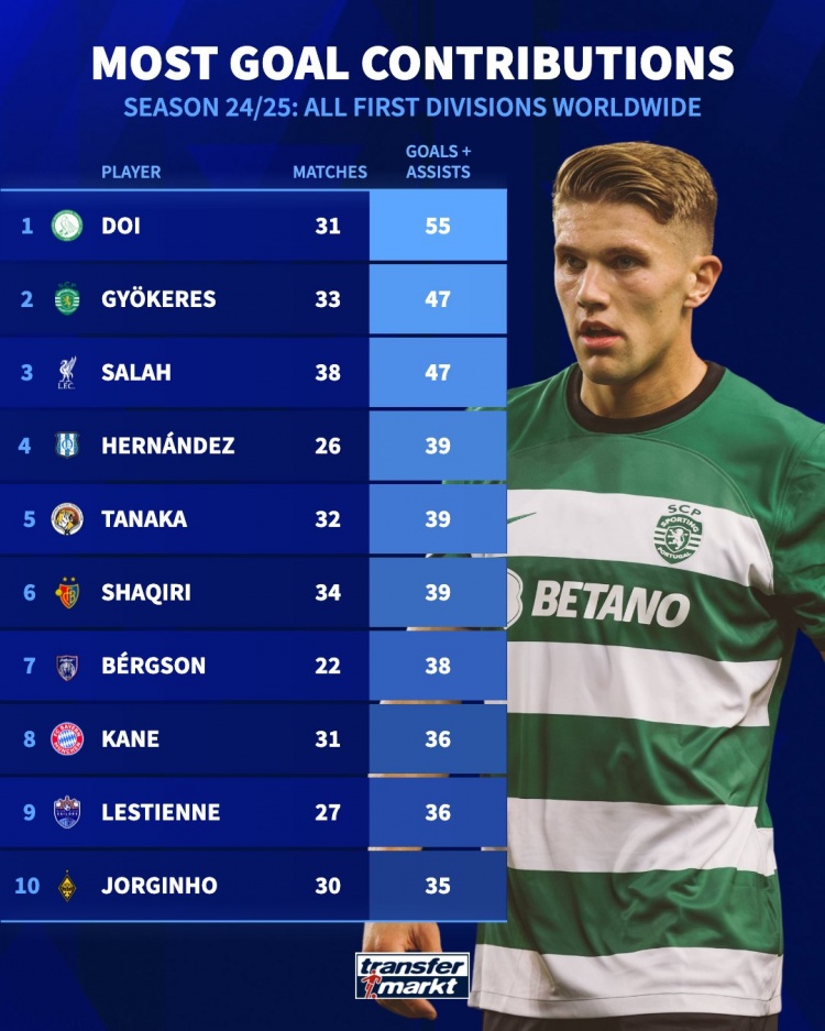 7月23日讯 德国转会商场统计了球员上赛季在顶级联赛(指列国一级联赛)的参与进球数目,并排出榜单,土井智之在新加坡联赛参与55球居首,约克雷斯、萨拉赫排行前三。