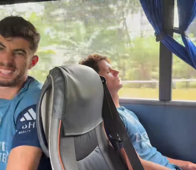 视频中阿森纳一众小年青在大巴上唱跳打闹拍窗户,31岁的新援诺尔高只合计吵闹,我方眉头紧锁闭目养神。