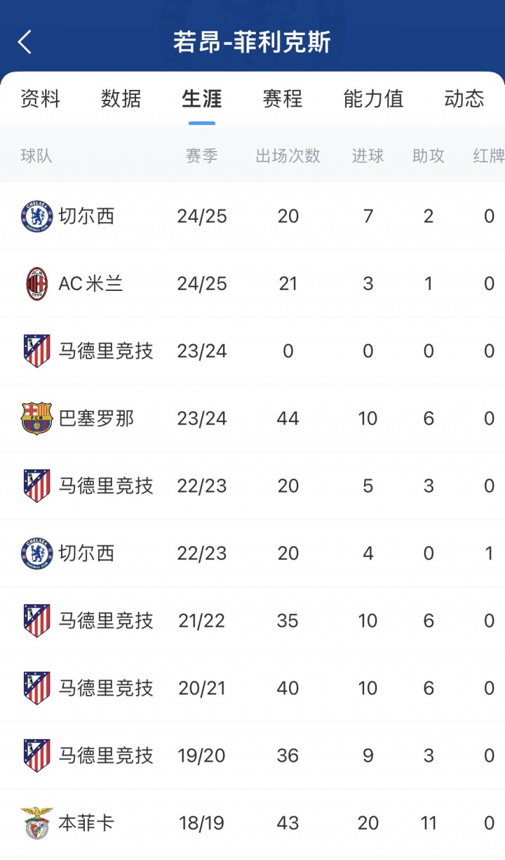 22/23赛季初始,菲利克斯三个赛季5次换队效率“流浪朱门”:切尔西→马竞→巴萨→米兰→切尔西。当今25岁的菲利克斯身价仅剩2000万欧。