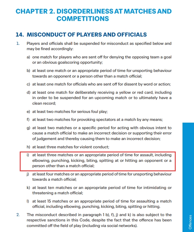 第h)条限定也指出,一朝场上对敌手行径被认定为暴力行径,禁赛期将是三场起步。