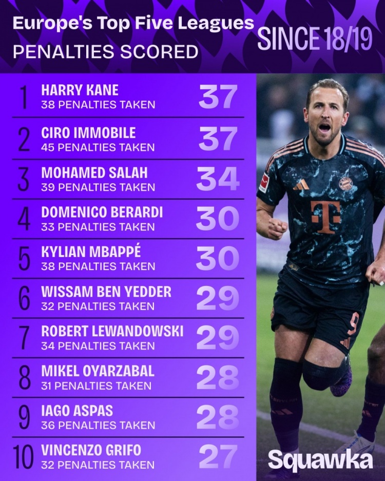 11月21日讯 Squawka统计了2018-2019赛季以来球员在五大联赛的点球进球数目,比肩出榜单,凯恩、因莫比莱37球居首,萨拉赫34球第三。