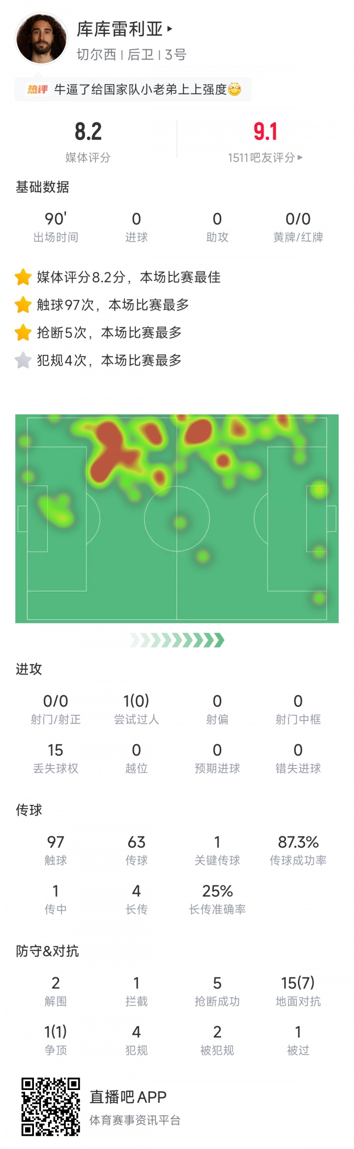 这一战库库雷利亚孝顺5次抢断2突围1阻拦,16次抵挡8次到手,他也到手当选欧冠官方评比出的本场比赛最好球员。切尔西的首粒进球便是来自他的传中酌量造乌龙,赛后库库雷利亚的评分亦然最高。