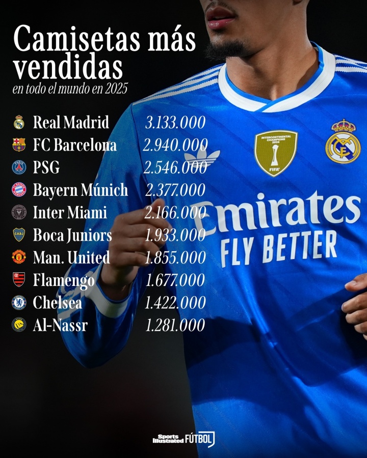 11月29日讯 体育画报依据Euromericas Sport Marketing数据,统计了2025年完毕现活着界足坛俱乐部球衣销量榜,皇马以313.3万件位居榜首,巴萨、巴黎分列二、三名。
