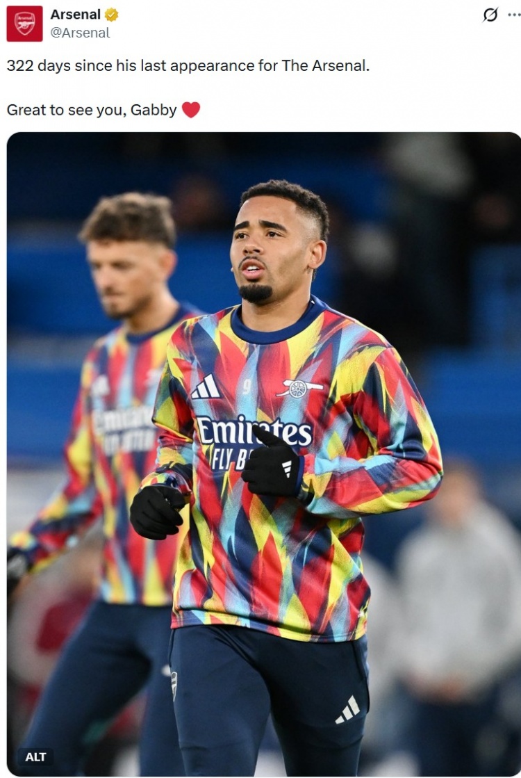 本场比赛热苏斯归来球队名单替补待命,阿森纳官推也晒出热苏斯赛前热身像片,配文写谈:“前次为球队出场也曾是322天前,很欢欣看到你归来,热苏斯!”