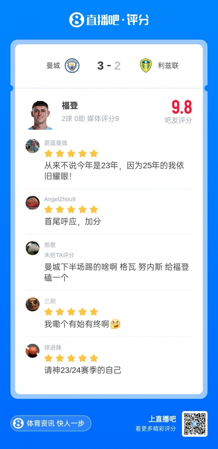 在曼城3-2战收效兹联的比赛中,福登双响+绝杀,强势宣告“太子”归来!福登赢得吧友8.4万票,无悬念当选【X咪咕体育英超第13轮最好球员】!