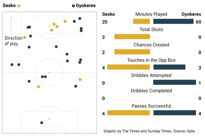 08月19日讯 英超首轮阿森纳客场1-0曼联,约克雷斯和塞斯科各自演出了个东说念主的英超首秀,泰晤士报说合OPTA统计了二东说念主的数据。