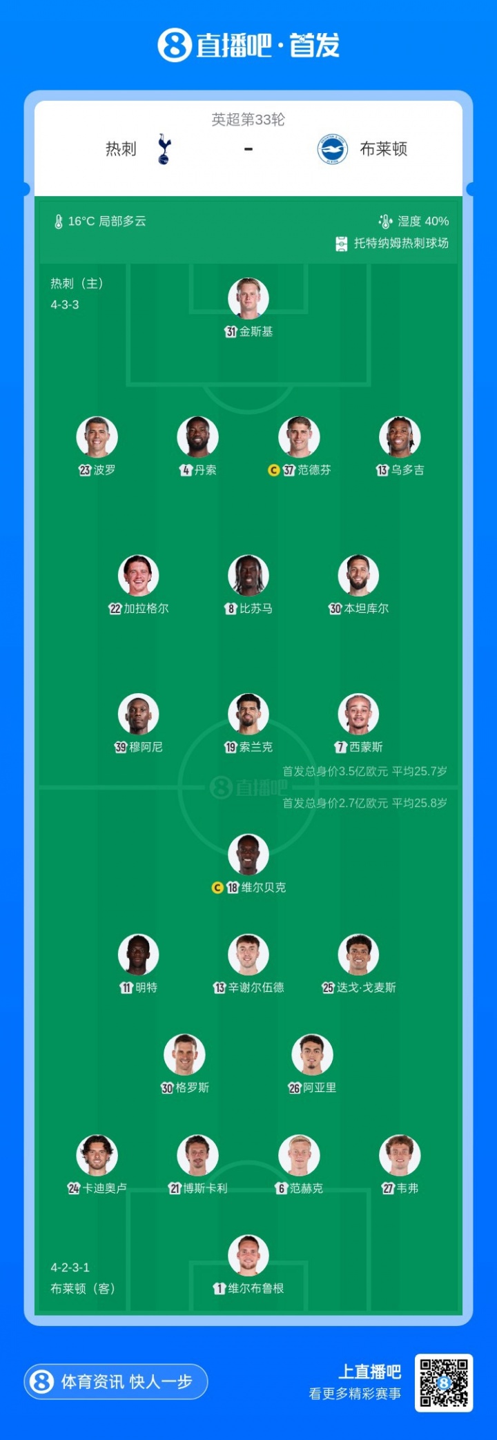 热刺杆位:31-金斯基、4-丹索、13-乌多吉、23-波罗、37-范德芬、7-西蒙斯、22-加拉格尔、8-比苏马、30-本坦库尔、19-索兰克、39-穆阿尼