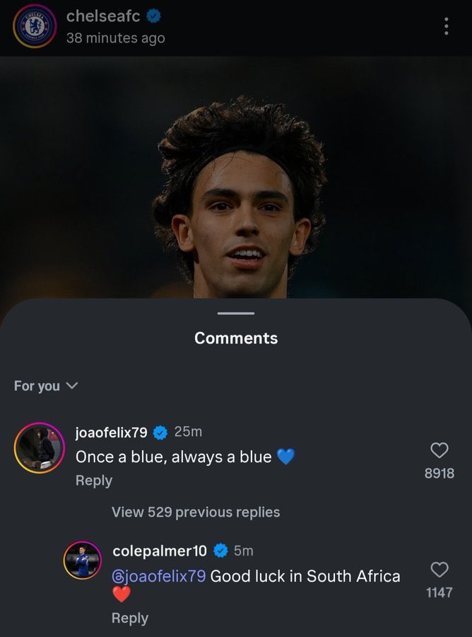 菲利克斯在切尔西官宣社媒上留言:“一日蓝军,终生蓝军。”帕尔默为他奉上祝愿:“在南非好运@菲利克斯。”