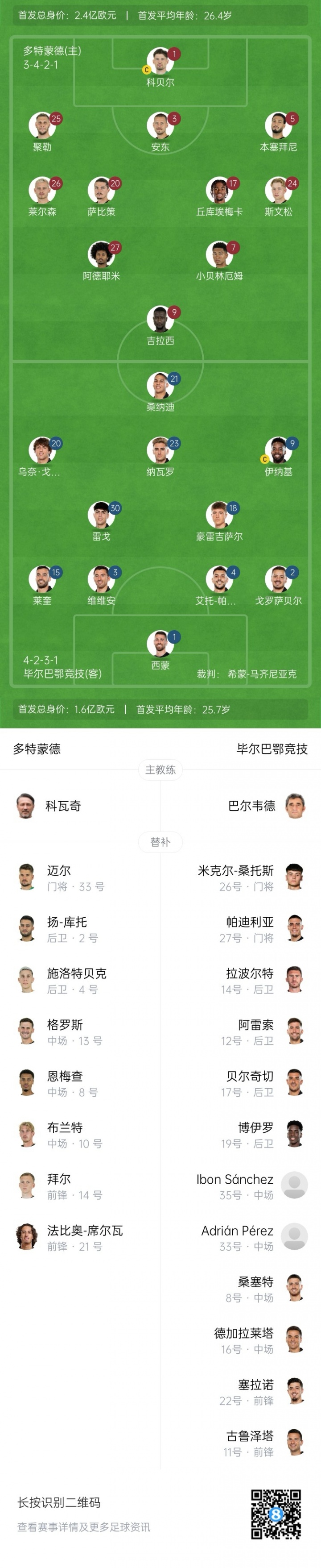多特首发:1-科贝尔、3-安东、5-本塞拜尼、24-好意思丽松、25-聚勒、26-莱尔森、7-小贝林厄姆、17-丘库埃梅卡、20-萨比策、9-吉拉西、27-阿德耶米