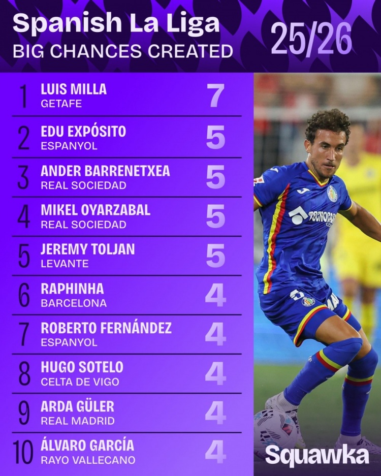 10月7日讯 日前,Squawka统计了本赛季西甲创造进球契机次数名次,拉菲尼亚、居勒尔4次并排第六。