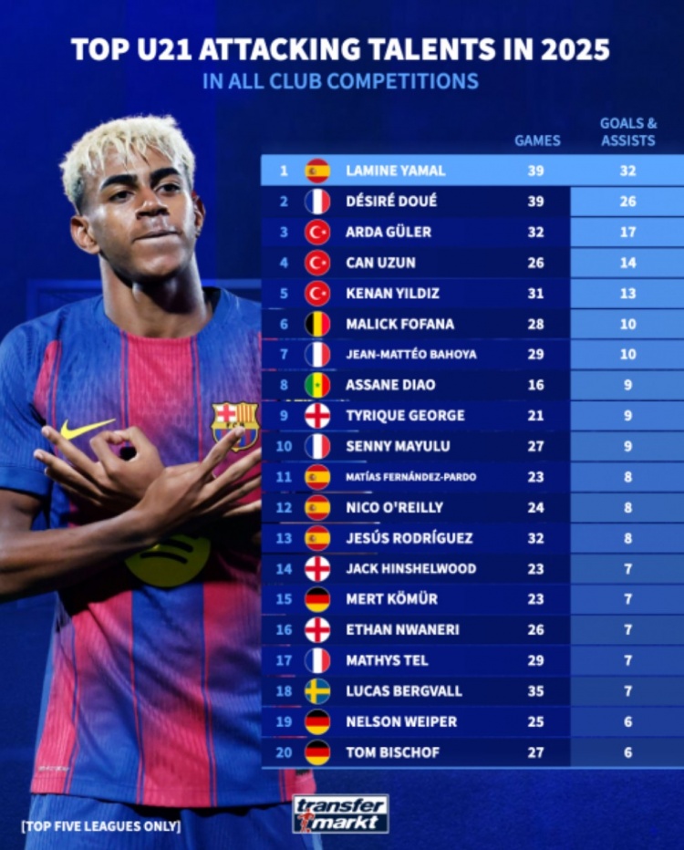 10月10日讯 德国转会市集盘货了2025年俱乐部层面各项赛事参与进球最多U21球员,亚马尔39场32球居首,杜埃39场26球位居次席。