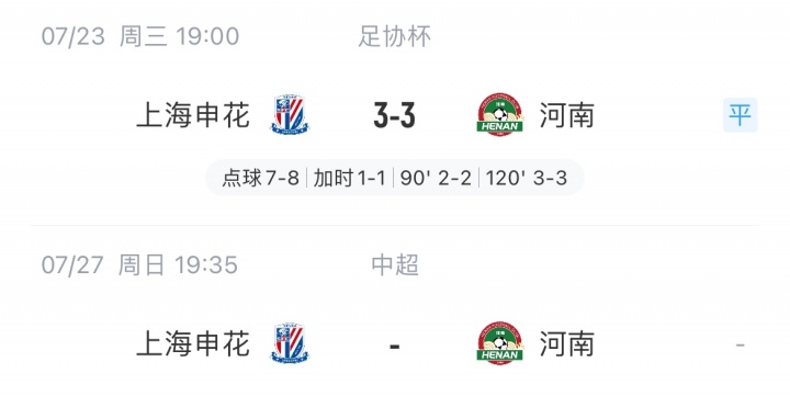 07月23日讯 当天足协杯1/4决赛,申花点球大战10-11惨遭河南淘汰,本周日两边将在中超第18轮再次相遇,现在申花暂位中超第1,河南暂位中超第13。