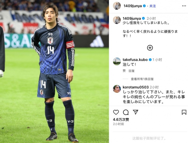 南野拓实、久保建英为这条社媒点赞,久保建英还奉上道喜:“尽快康复!”