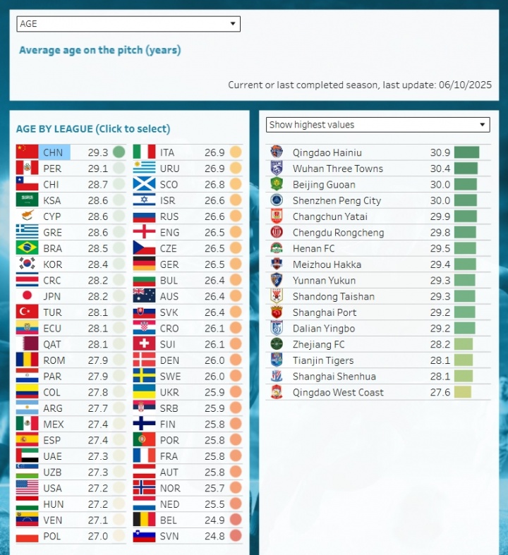 据CIES统计,在寰球50个主流联赛中,中超的平均年事为29.3岁,仍为寰球最高,比第二的秘鲁联赛逾越0.2岁。