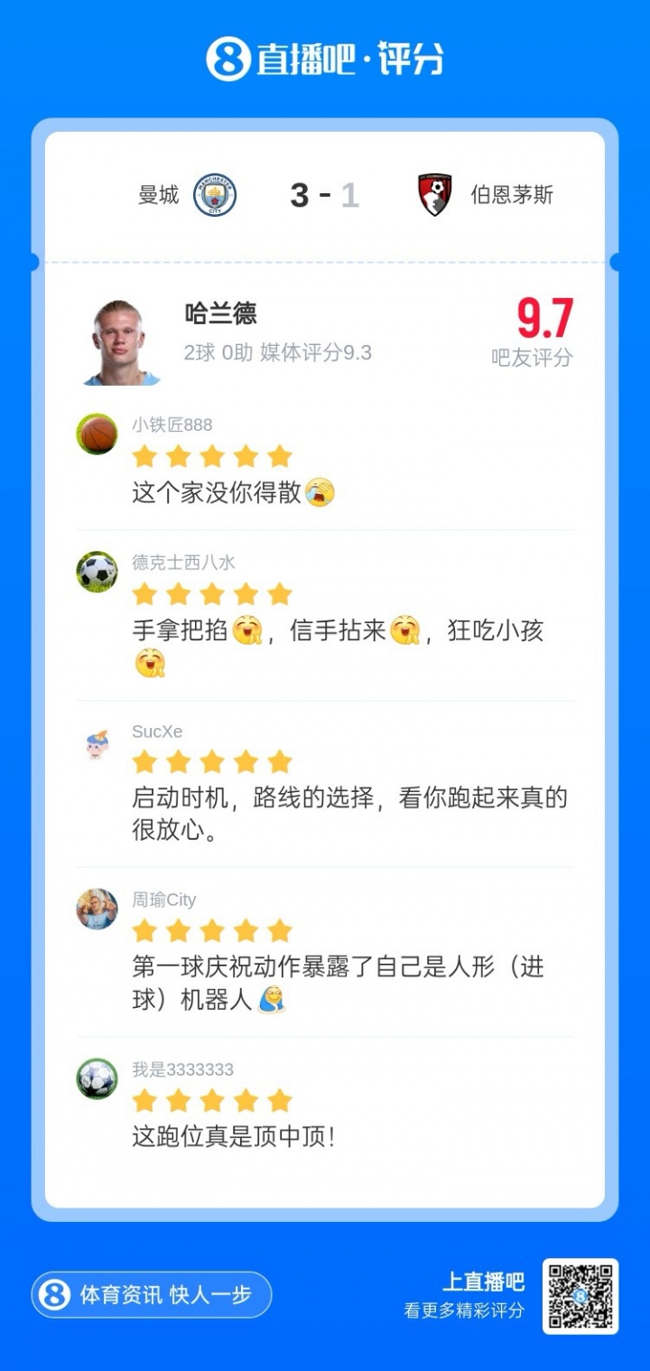 曼城时尚哈兰德梅开二度,匡助曼城3-1慑服伯恩茅斯升至第二。哈兰德赢得吧友超7万的投票,当选【X咪咕体育英超第10轮最好球员】!