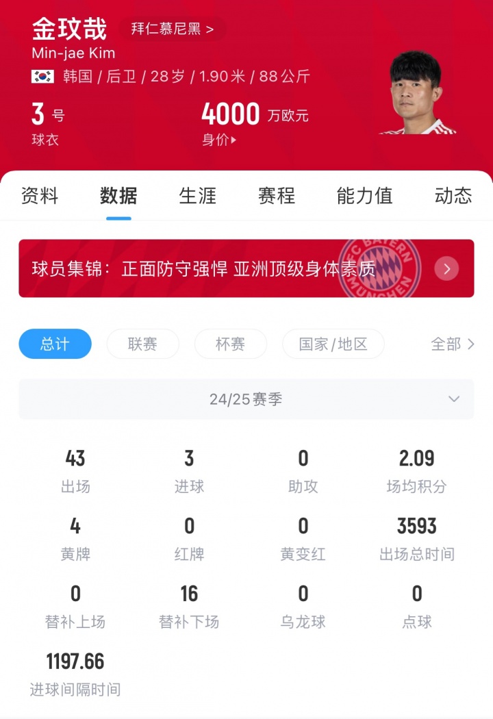 金玟哉现年28岁,他上赛季为拜仁出场43次,孝顺3粒进球,现身价4000万欧。