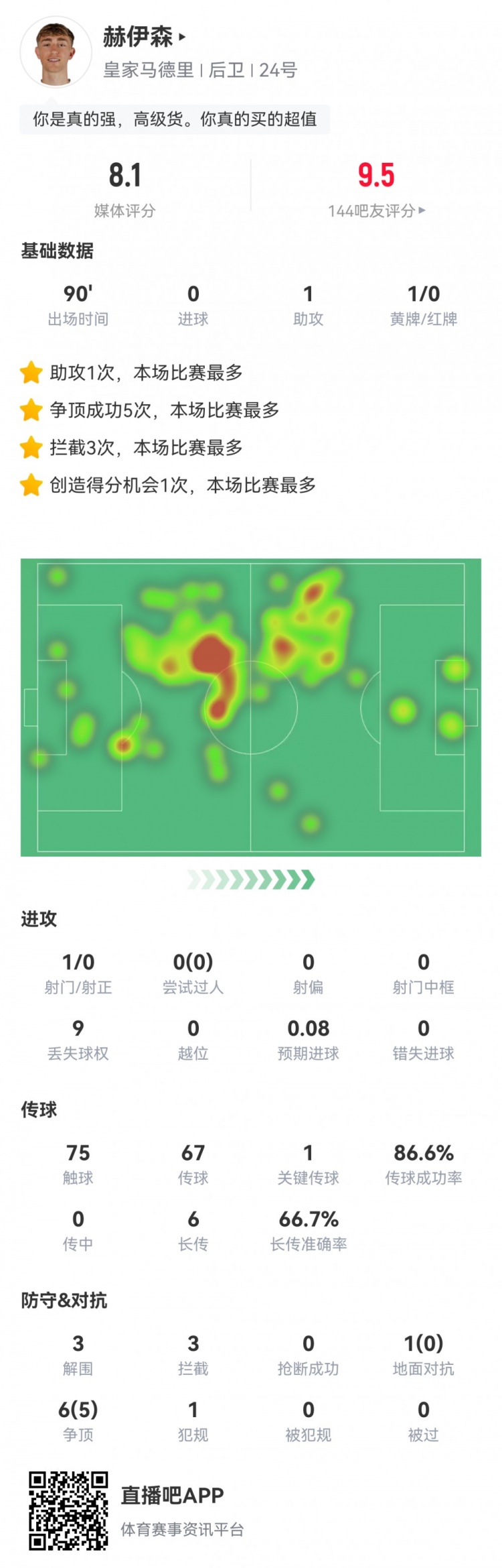 8月31日讯 西甲第三轮,皇马2-1马洛卡。此役赫伊森首发打满全场,球员全场要点数据如下↓