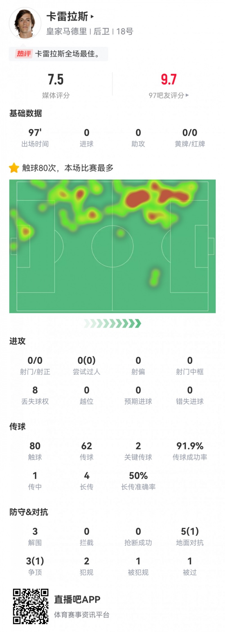 8月31日讯 西甲第三轮,皇马2-1马洛卡。此役卡雷拉斯首发打满全场,球员全场重心数据如下↓