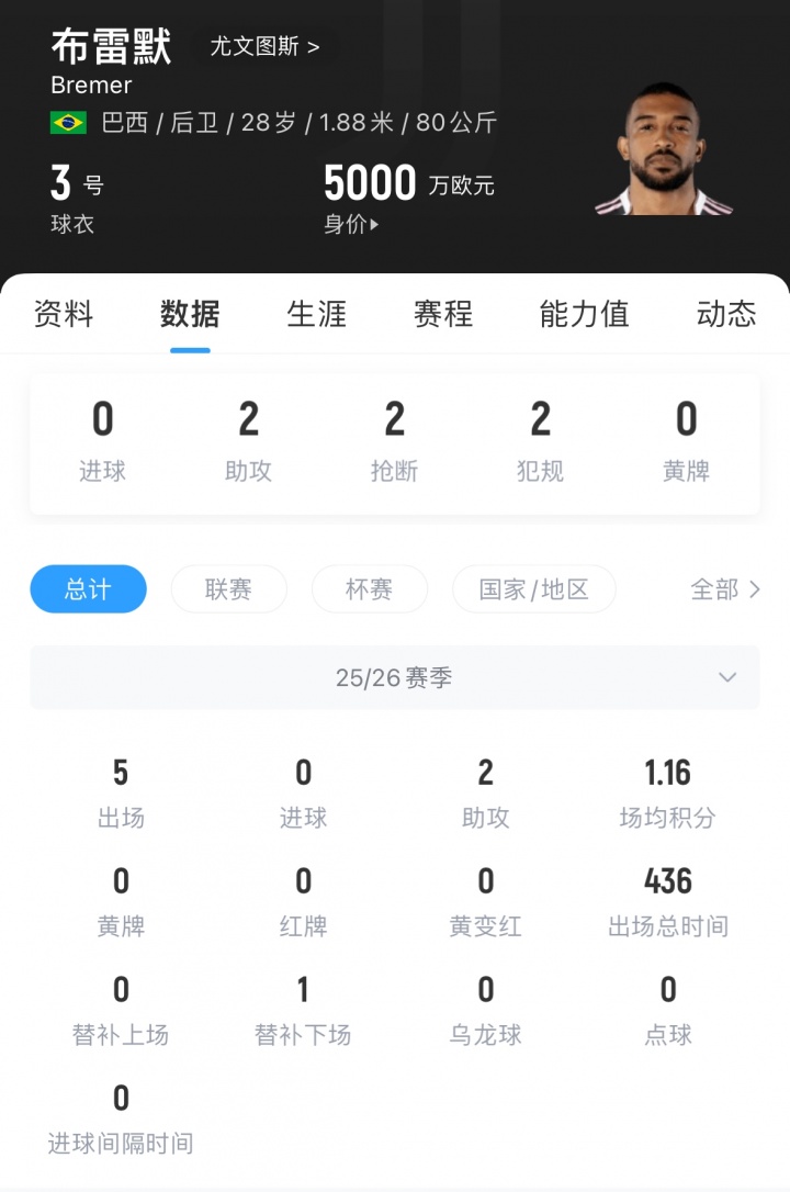 布雷默旧年10月遭受十字韧带断裂重伤,本年8月重返赛场,本赛季他为尤文出场5次,他上一次为球队出场是9月28日1-1战平亚特兰大的比赛。