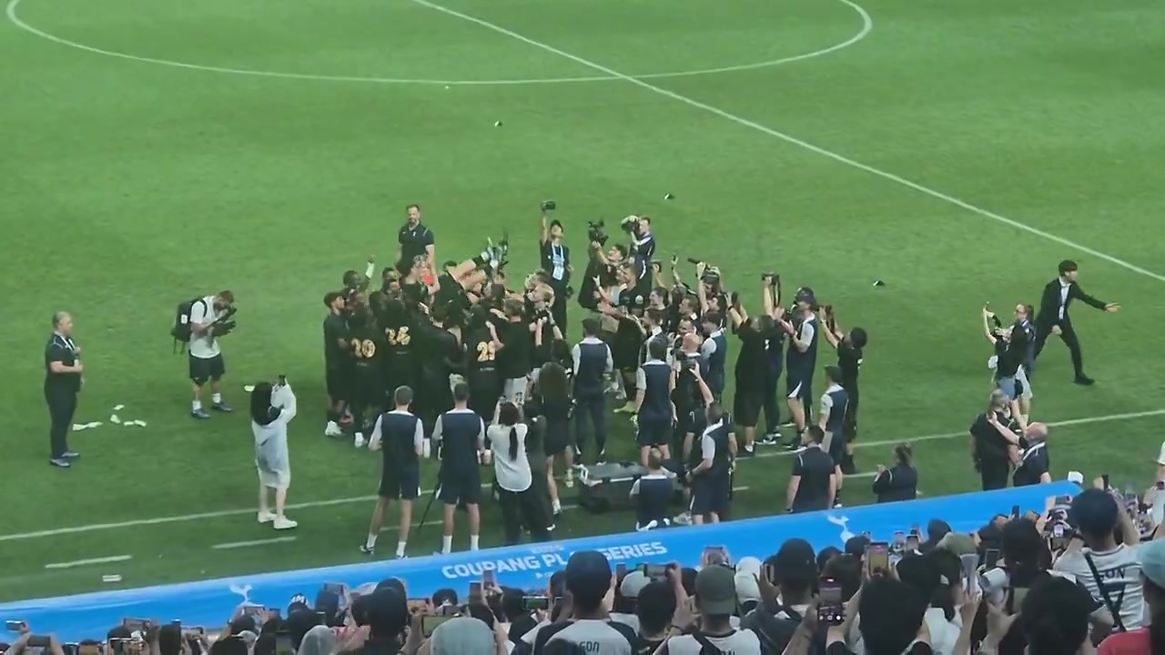 8月3日讯 足球友谊赛,热刺1-1战平纽卡。赛后,热刺全队将孙兴慜抛向空中。