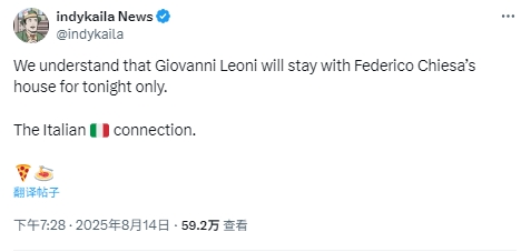 08月14日讯 博主indykaila News(转会新闻“绿帽哥”)爆料,接近加盟利物浦的意大利后卫莱奥尼今晚将在队内的意大利老乡——小基耶萨家借住。