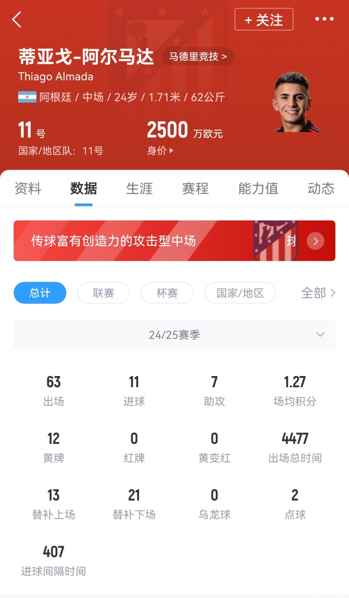格里兹曼现年34岁,很快需要替补。阿尔瓦雷斯将承担大部分创造力,但阿尔马达上赛季在法甲每90分钟创造2.1次契机标明他能成为高水平孝顺者。要道在于,他无球时也很致力,上赛季在对方前场每90分钟1.2次告捷抢断。