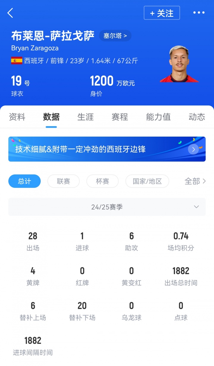 自2023-24赛季初度亮相以来,萨拉戈萨在西甲统共出场3488分钟,平均每90分钟完成2.84次告捷过东说念主。这在通盘球员中名按次六,仅次于亚马尔、阿克马赫、尼科·威廉姆斯、维尼修斯和萨维尼奥。他的智商足以让防御失衡,号称顶尖。
