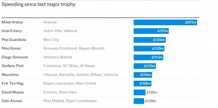 电讯报统计了上一次夺冠之后,各大主帅在引援上的累计破耗,阿尔特塔断层第一,埃梅里、瓜迪奥拉、科瓦奇、西蒙尼分列2-5位,滕哈赫排在第8位。