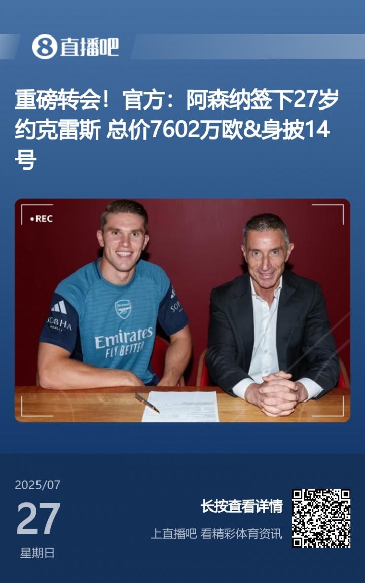 凌晨阿森纳终于官宣了葡体时尚约克雷斯加盟的音信,这依然是枪手今夏签下的第6名球员。