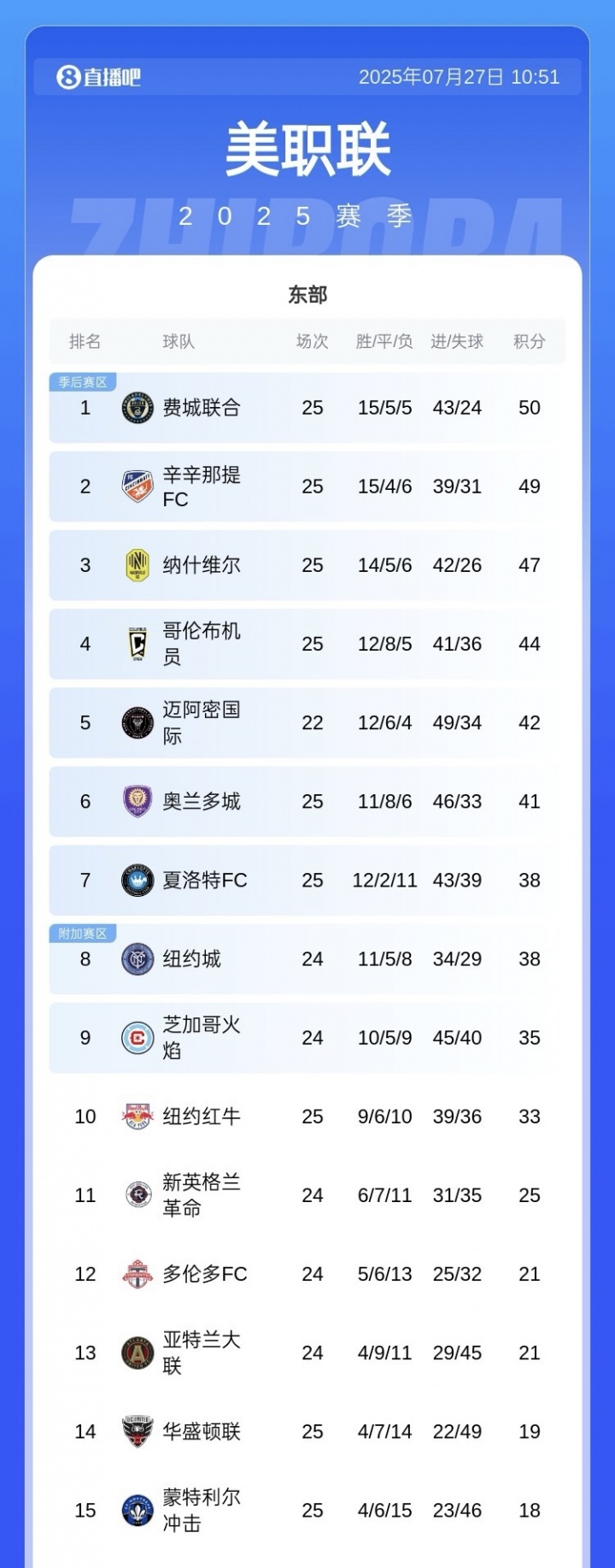 你的位置:全运会足球直播 > 意甲联赛 > 不息追分!好意思职联积分榜:迈阿密少赛3场排在东区第五,距榜首8分
