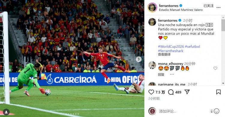 此役是费兰-托雷斯为西班牙队出战的第50场比赛,他在酬酢媒体上晒出比赛像片,配文:“值得铭刻的夜晚,为西班牙出战50场,这是一场极端卓著的比赛,到手让咱们距离寰宇杯更近一步。”