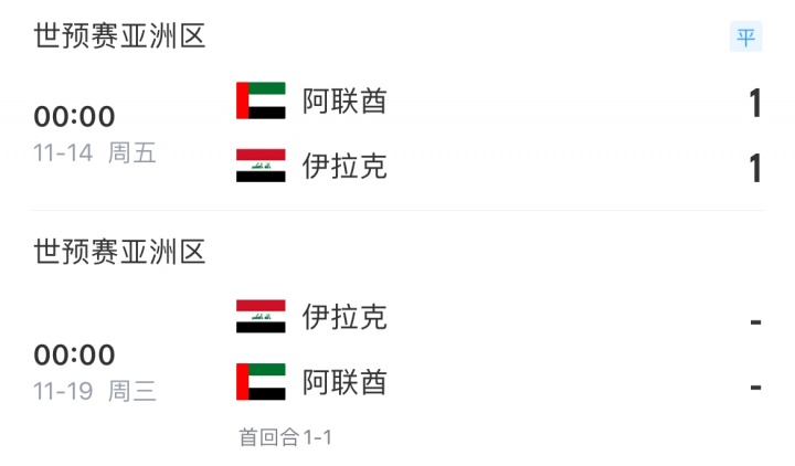 11月14日讯 世初赛亚洲区第五阶段首回合,伊拉克与阿联酋1-1战平,两边在的第二回合较量前持续保抓巧妙均衡。