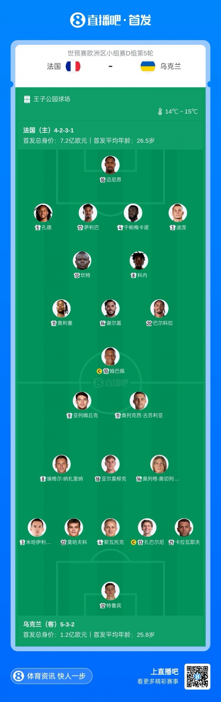 11月14日讯 世初赛欧洲区小组赛D组第5轮,法国主场迎战乌克兰,赛前两边首发公布。
