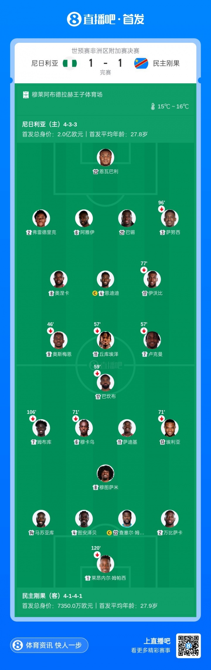 11月17日讯 世初赛非洲区附加赛决赛,尼日利亚点球大战不敌民主刚果,皆集两届无缘寰宇杯。比赛中,尼日利亚主帅的换东谈主操作激励热议。