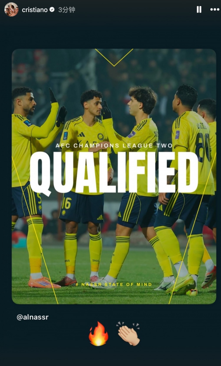C罗更新外交媒体晒照道喜球队小组头名出线,并配上神采:🔥👏