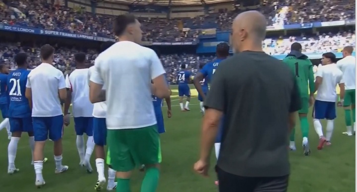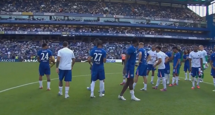 赛前切尔西在场所中央展示奖杯↓