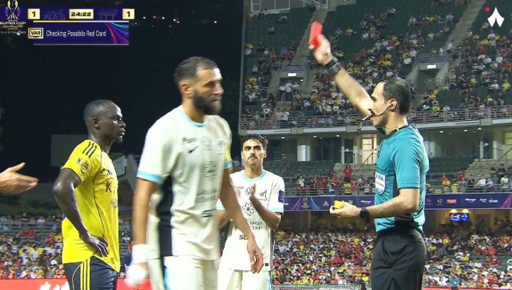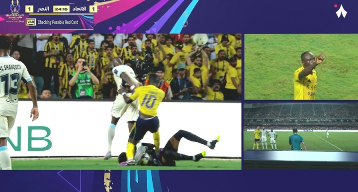 08月19日讯 利雅得告捷vs吉达连合第24分钟,佩雷拉护球给门将,马内从后纠缠,临了伸脚踩到敌手肚子!VAR介入,黄牌改红牌!