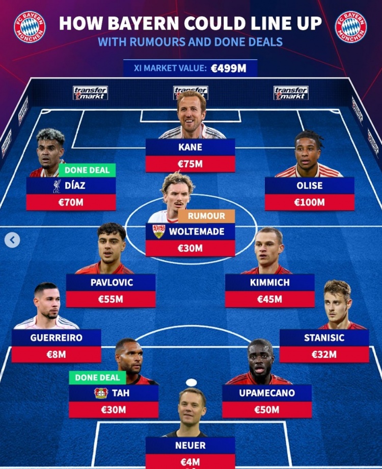 德转策动拜仁新赛季主力阵:总身价4.99亿欧元