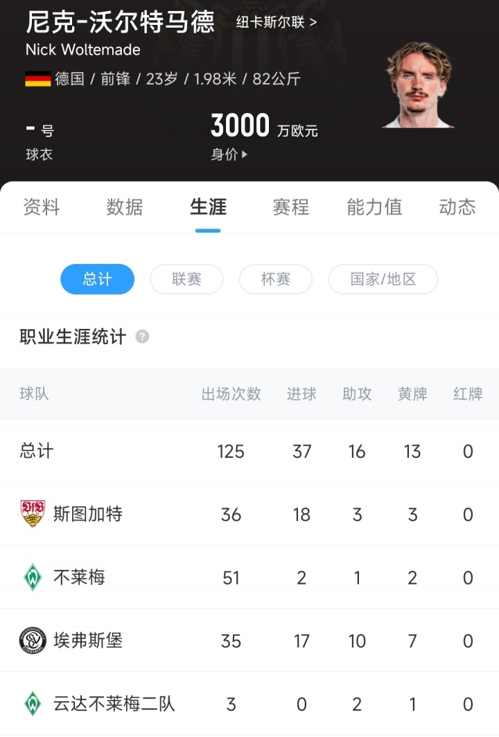 08月30日讯 官方音讯,纽卡斯尔从斯图加特签下23岁的沃尔特马德,德转数据暴露,沃尔特马德的转会费为8500万欧元。