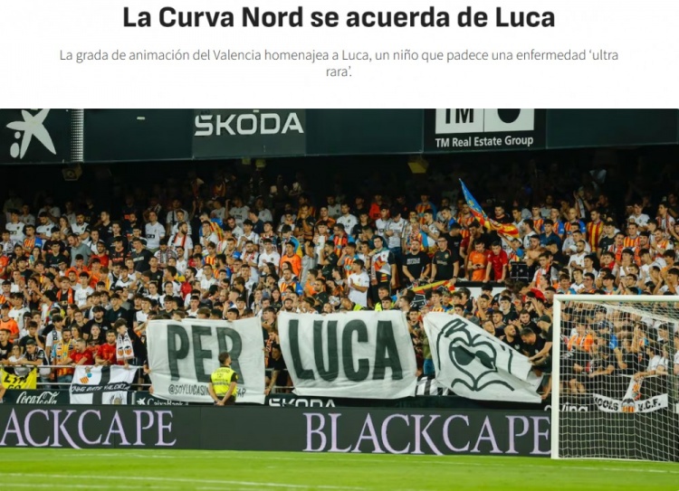 在瓦伦西亚对阵赫塔费赛前,北看台张开了印有“为了卢卡”的巨型横幅,与比心手势组成主体,掌心中央绘有一副墨镜图案。