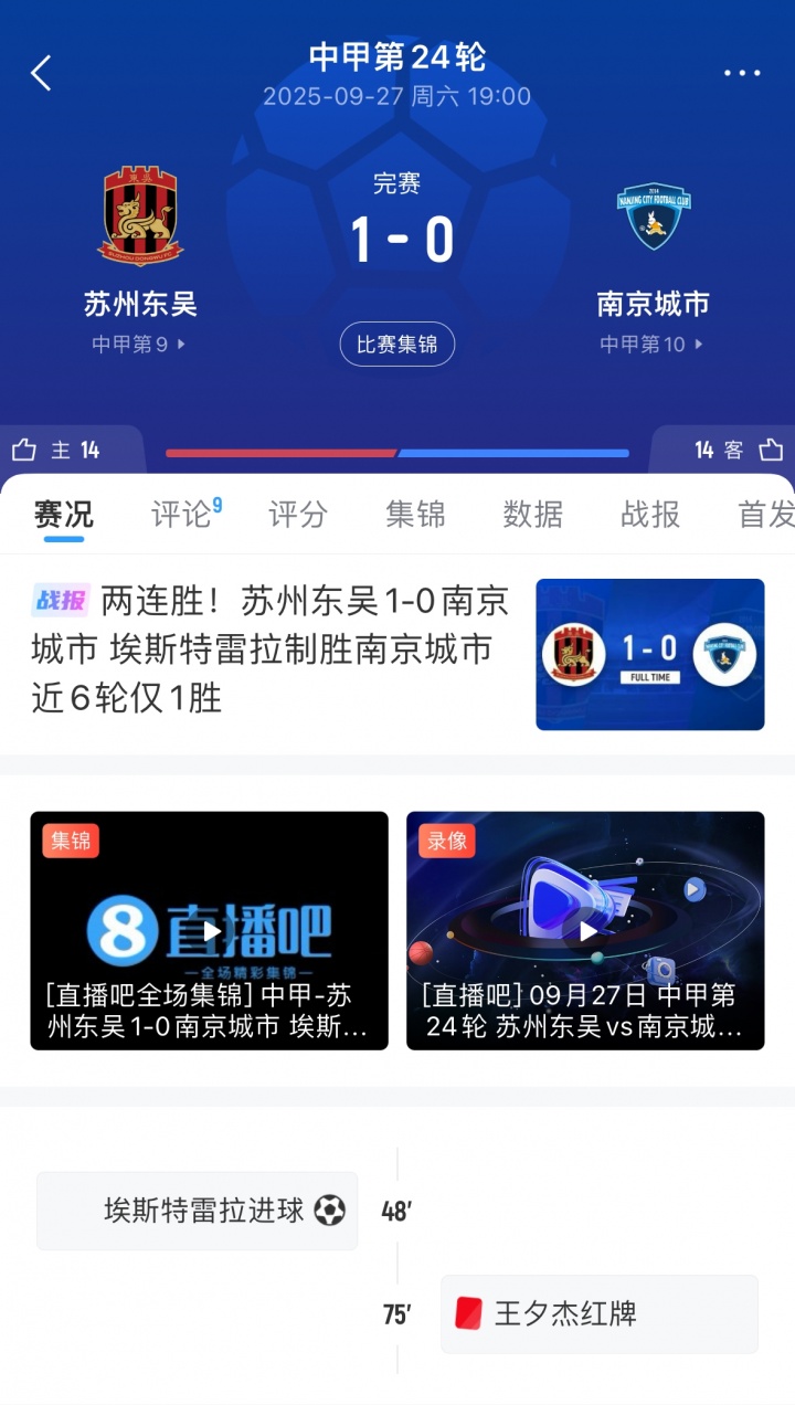 2025年9月27日,中国足球甲级联赛第二十四轮场序第190场,苏州东吴足球俱乐军队与南京城市足球俱乐军队的比赛在苏州市体育中心露出场举行。
