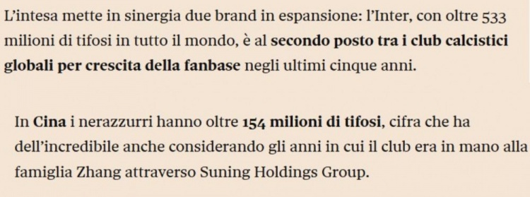 报谈写谈:“这项合同让两个处于彭胀中的品牌变成协同效应。国米在世界领有逾越5.33亿球迷,是昔时五年中世界粉丝增长速率第二快的足球俱乐部。”