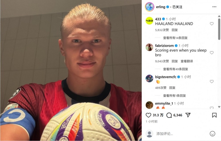 赛后,哈兰德更新社媒晒出比赛用球,但他莫得任何的配文。