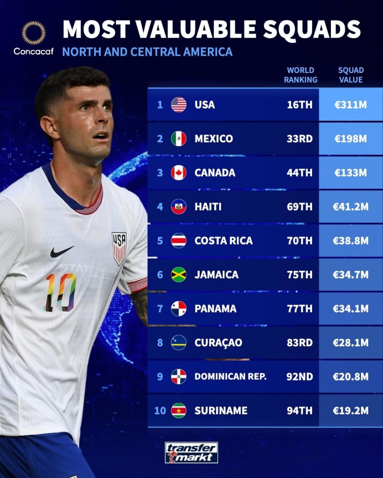 10月12日讯德国转会阛阓网公布中北好意思及加勒比海足联国度队身价名次,好意思国队以3.11亿欧元总身价位居榜首,墨西哥(1.98亿欧元)与加拿大(1.33亿欧元)分列二、三位。